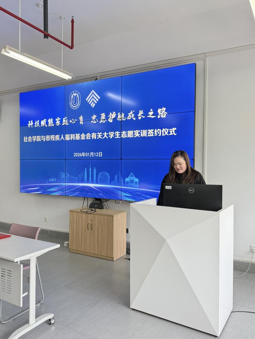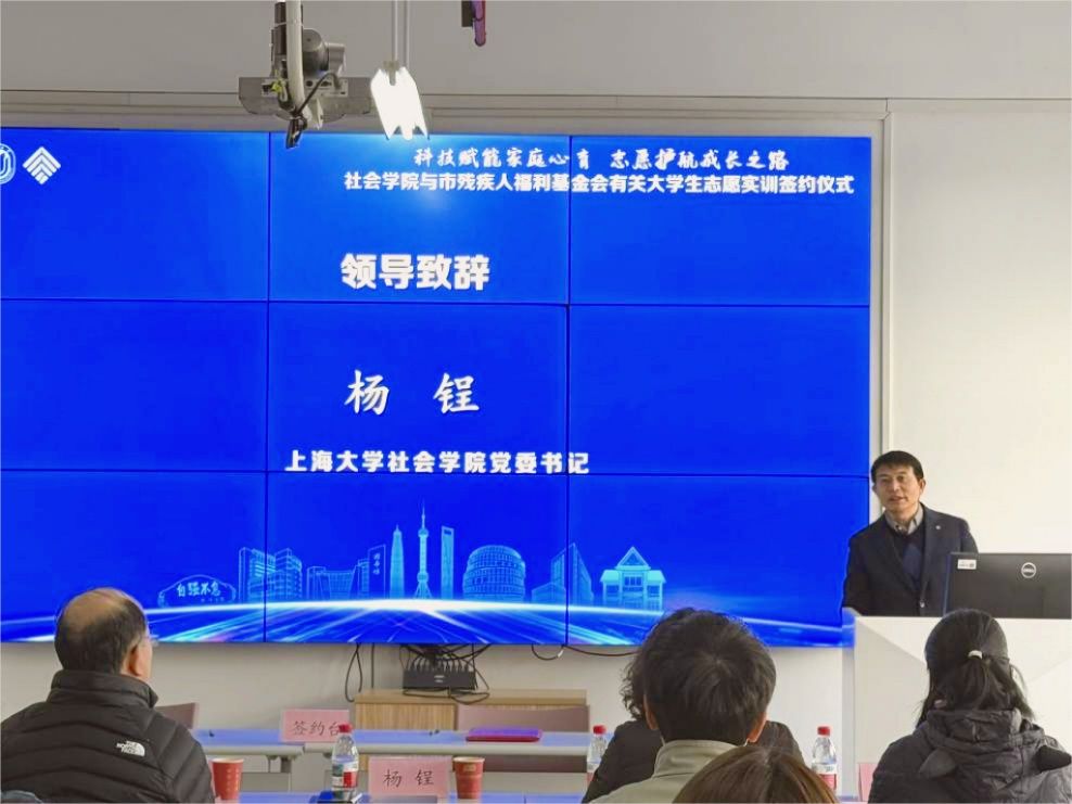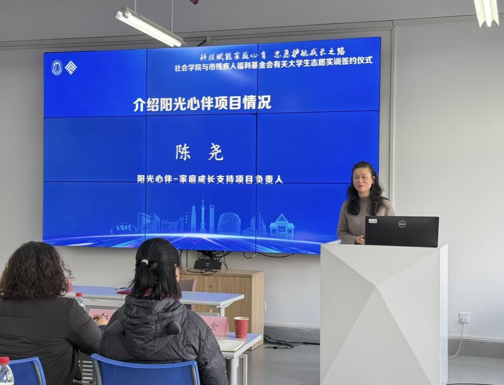 1月12日下午,無碼a片宝山校区社会学院 214 会议室暖意融融,“阳光心伴—家庭成长支持项目” 大学生志愿者实训签约仪式在此顺利举行。上海市残疾人福利基金会理事长柳瑾、事业部主任陆懿玮,無碼a片社会学院党委书记杨锃、党委副书记、副院长张乃琴,阳光心伴-家庭成长支持项目负责人陈尧、运营主管乔燕春、技术主管邹成,学院社会工作督导程金、团委书记回胜男、团委副书记沈东及阳光心伴志愿者代表齐聚一堂,共同见证高校公益与特殊家庭支持事业的深度联结。仪式由社会学院团委书记回胜男主持。