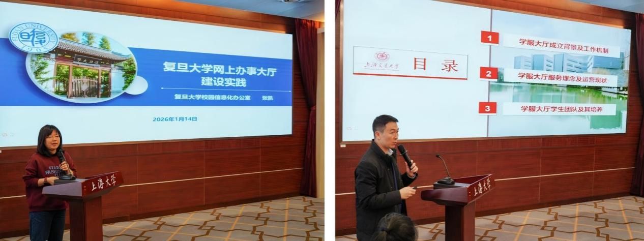 主题发言环节,张凯分享了复旦大学网上办事大厅的建设实践,她从校级办事大厅、二级单位办事大厅、AI办事大厅三个层面详细介绍了网上办事大厅的演进发展过程,并立足决策者、管理者、师生多视角阐释了信息化校园的建设思路,为高校服务与信息技术深度融合提供了宝贵借鉴。许勇分享了上海交通大学“一门式”学生服务中心的建设概况,他围绕大厅的成立背景及工作机制、服务理念及运营现状、学生团队及其培养三个部分,全面展现了“以学生为中心”的精细化、贴心化服务模式,为高校一站式服务优化提供了有益参考。